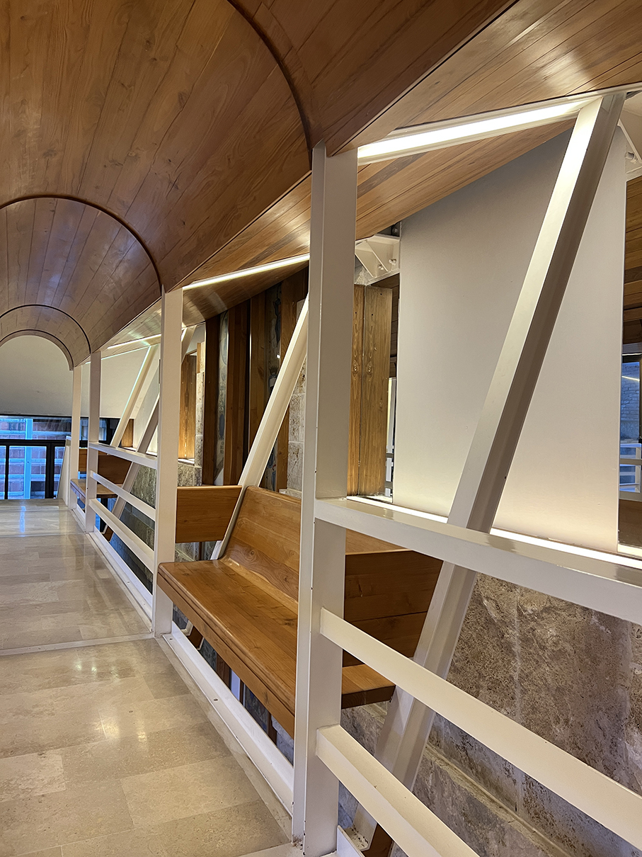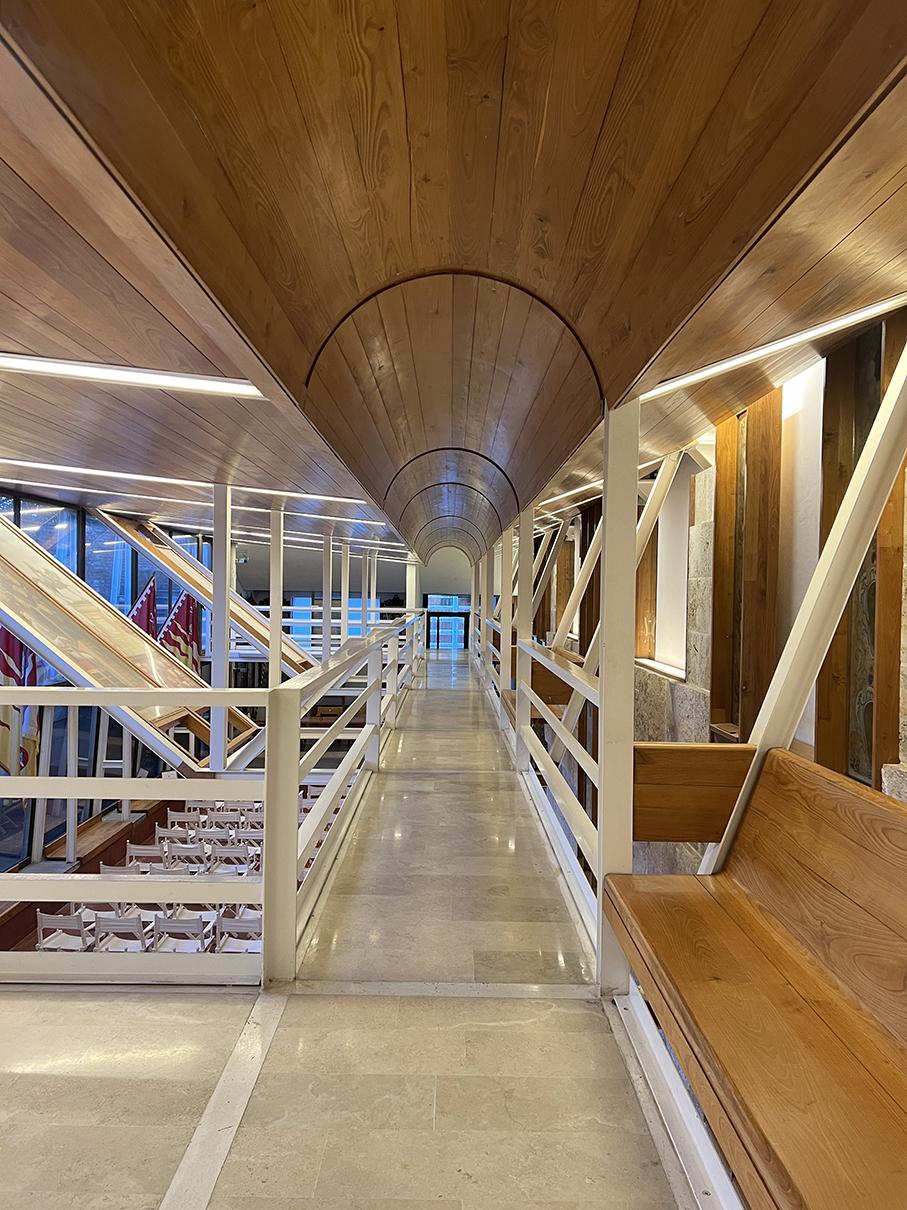 无论流动得多么顺滑的空间,讲述起来都甚是抽象。但漫步其间,很难不赞叹建筑师处理地形的手法巧妙。这个议会厅像从地底生长出来,每个高度与周边城市的连接都那么自然流畅,就像米开朗基罗说他的那些雕塑:它们已经在那里了,他只是把多余的石头敲掉而已。Michelucci的空间也给人差不多的印象:楼板、走廊和阶梯本就存在,建筑师只是把覆在其上的土层移走了而已。