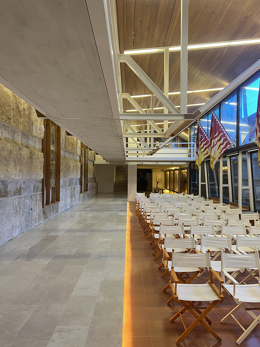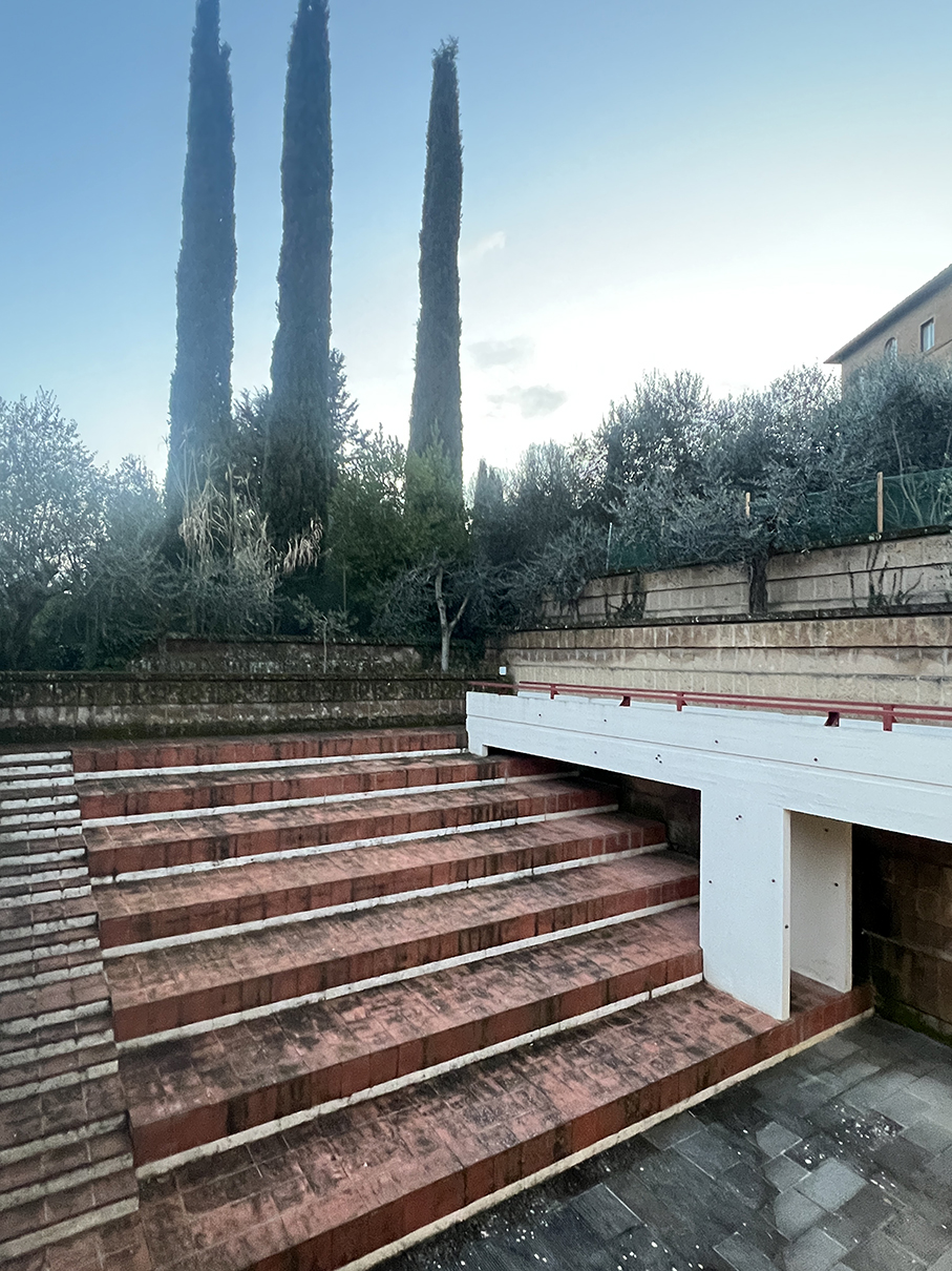 Michelucci被公羊区邀请来做区议会厅和区博物馆的设计时,在圣三一礼拜堂旁的斜坡上发现了一块方正的空地,他利用高差关系把建筑埋到半地下,原来的空地仍保留作为露天小广场,只留小小一个入口亭通过阶梯与下方的议事厅连接。议事厅上方悬空的挑廊连接着斜坡中段建筑另一个入口,而坡底接近区博物馆的位置又有第三个入口,从这里进来的人可以通过一个庭院来到议事厅尾端的室外阶梯小广场。夏天会议从室内平移到室外,阶梯广场边缘的丝柏树想必见证了公羊区人民很多热火朝天的讨论。